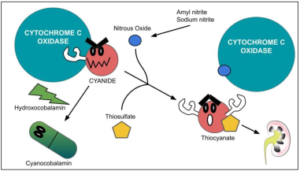 Antidote: Hydroxocobalamin (5 g IV) or Sodium Thiosulfate (12.5 g IV). Hydroxocobalamin binds cyanide, forming non-toxic cyanocobalamin. Thiosulfate converts cyanide into thiocyanate, excreted in urine.